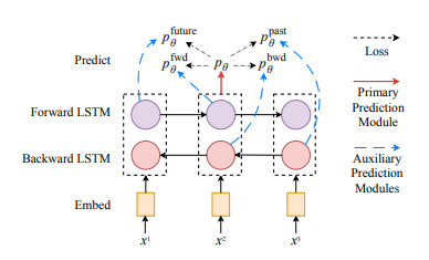 图 2:序列标注模型中的辅助预测模块。每个模块都只看到受限视角的输入。例如,「forward」预测模块在预测当前 token 的标签时看不到它右侧的语境。为简洁起见,这里仅展示了一个层 Bi-LSTM 编码器,以及该模型一个时间步的预测。
