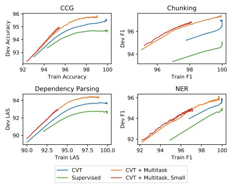 多个任务的标注数据对多任务系统的学习很有用,但是大部分数据集只为一个任务而标注。因此多任务 CVT 的一个好处就是模型基于无标注数据创建了适用所有任务的(artificial)标注数据。这显著改善了模型的数据效率、缩短了训练时间。由于运行预测模块计算成本较低,因此计算用于多个任务的 LCVT 并不比单任务模型慢多少。但是,我们发现适用所有任务的标注数据可以大幅加速模型收敛速度。例如,在六个任务上训练的 CVT 模型收敛时间大约是单个任务上模型的平均收敛时间的 3 倍,总训练时间降低了 50%。