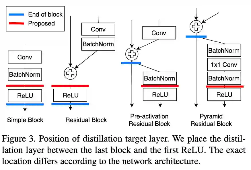 他们认为我们获取hints的位置不是最佳的。通过ReLU对输出进行细化,在转换过程中会丢失一些信息。他们提出了marginReLU激活函数(移位的ReLU)。“在我们的margin ReLU,积极的(有益的)信息被使用而没有任何改变,而消极的(不利的)信息被压制。结果表明,该方法可以在不遗漏有益信息的情况下进行蒸馏。“
