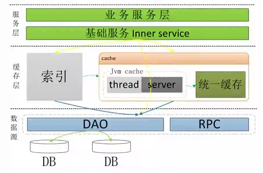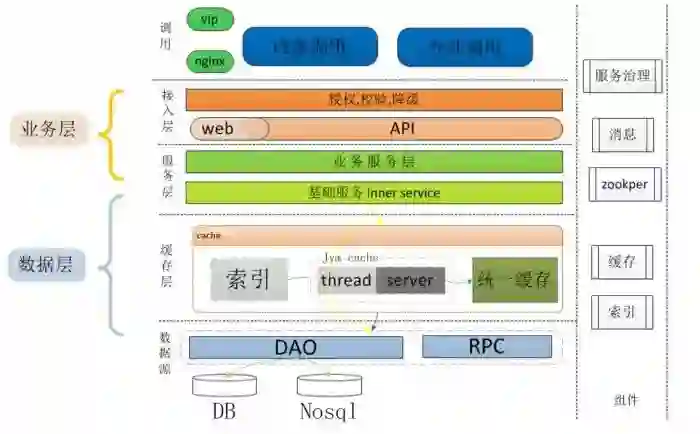 业务层、数据层的范围越来越宽泛,业务层可以分为基础服务与组合服务;数据层分为数据源与索引缓存;依赖的技术或中间件需要有效的结合,用于解决系统所遇到各种问题。