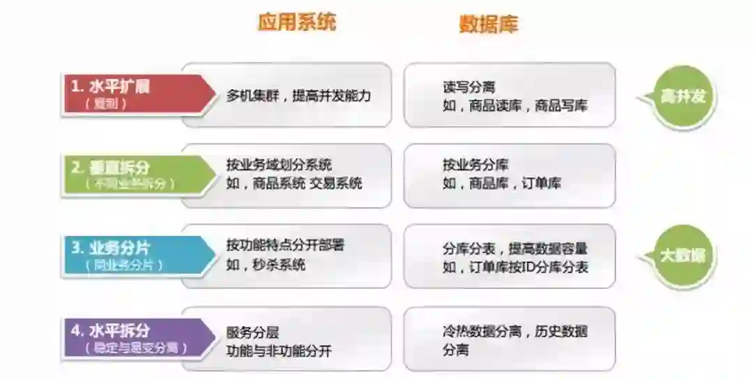 系统拆分从资源角度分为应用拆分和数据库拆分,而从采用的先后顺序则可分为: