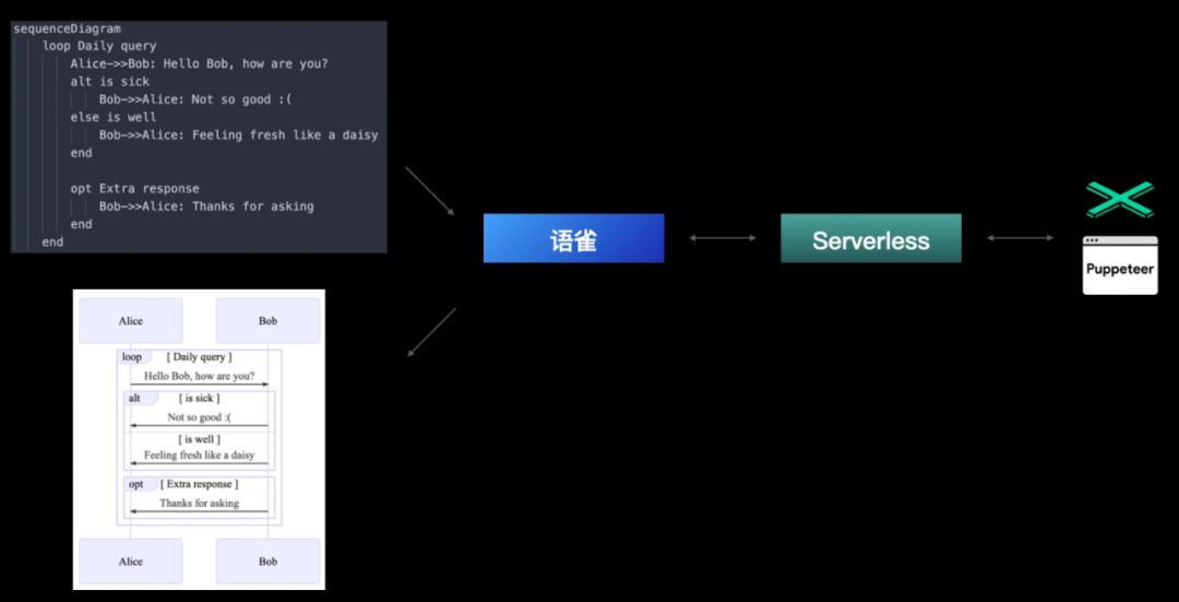在语雀上我们支持各种代码形式来绘图,包括 Plantuml、公式、Mermaid,还有一些将文档导出成 PDF、图片等功能。这些场景有两个特点: