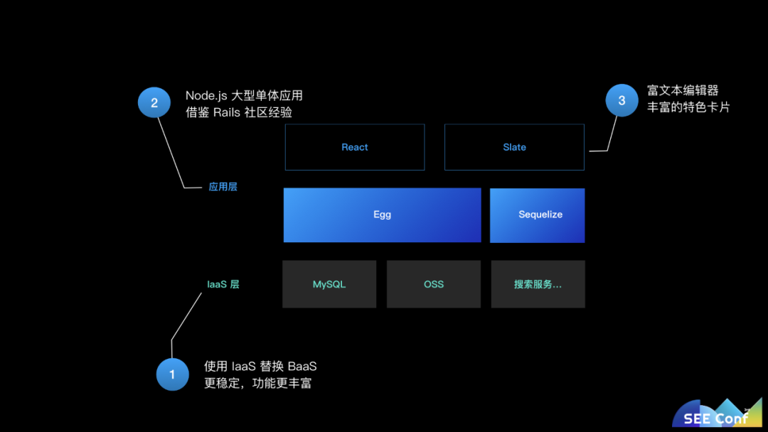 - Web 层仍然采用了 Node.js 与 Egg 框架,但是业务层借鉴 rails 社区的实践开始变成了一个大型单体应用,通过引入 ORM 构建数据模型层,让代码的分层更清晰。