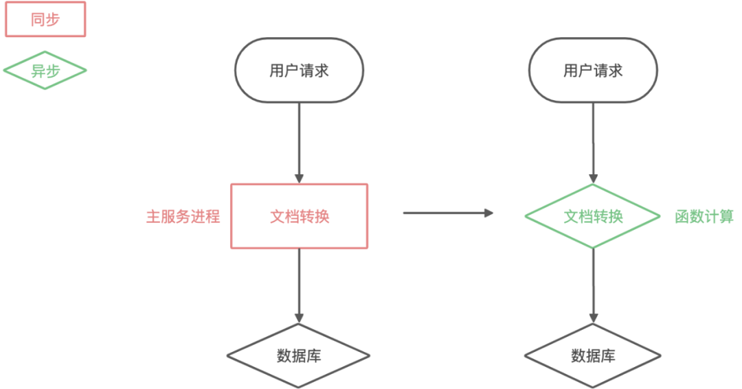 但是随着函数计算的引入,我们将这个消耗 CPU 的转换逻辑放到函数计算上,语雀的主服务稳定性不会再被影响。