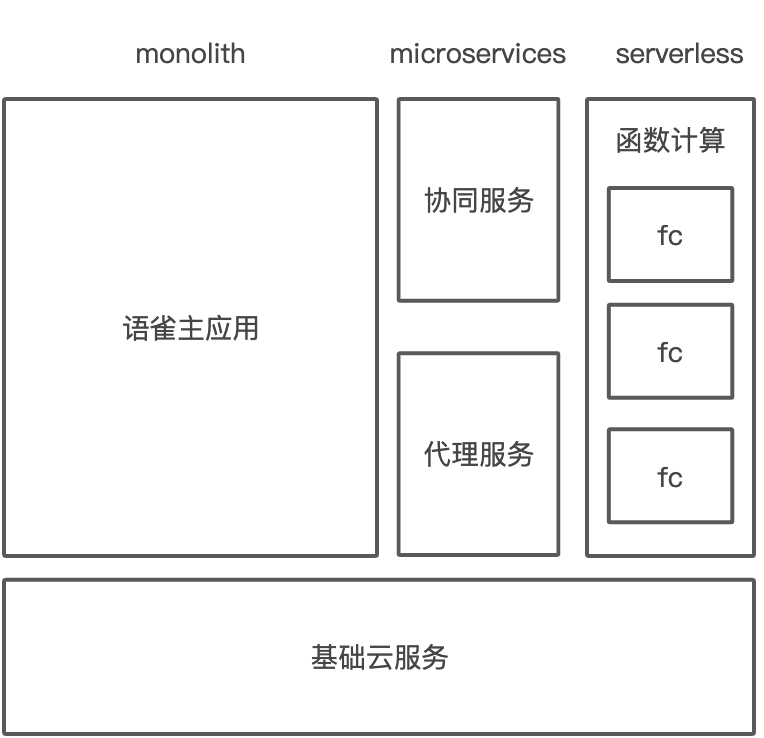 在引入函数计算之后,语雀现阶段的架构变成了以一个 Monolith Application 为核心,并将一些独立的功能模块根据使用场景和对能力的要求分别拆分成了 Microservices 和 Serverless 架构。