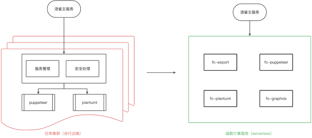 在没有引入函数计算之前,语雀为了支持这些功能,尽管单独分配了一个任务集群,在上面运行这些三方服务,接受主服务的请求来避免影响主服务的稳定性。但是为了解决上面提到的一系列问题还需要付出很大的成本: