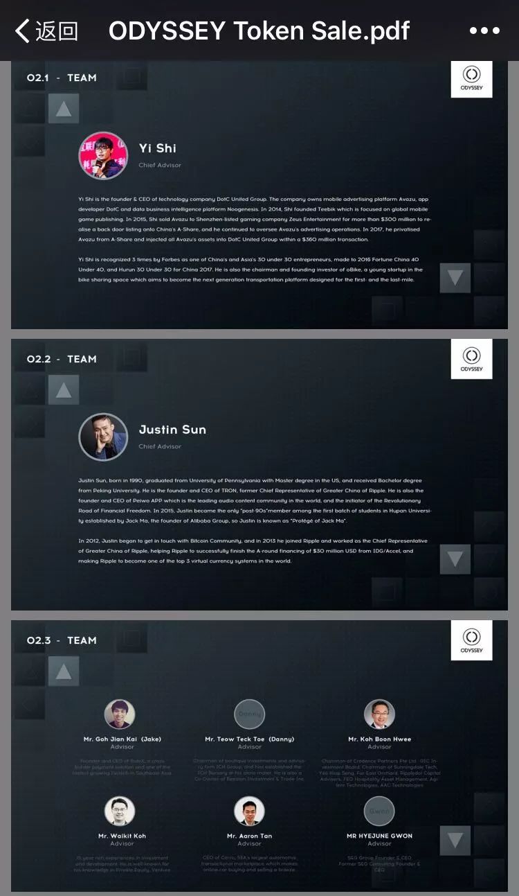 孙高峰则向铅笔道出具一份Odyssey token Sale的白皮书(即OCN白皮书),在Team介绍一栏,出现的首个名字便是石一,其次为Justin Sun,即波场孙宇晨。二人的Title的皆为首席顾问——而最令人扑朔迷离之处也在于此。