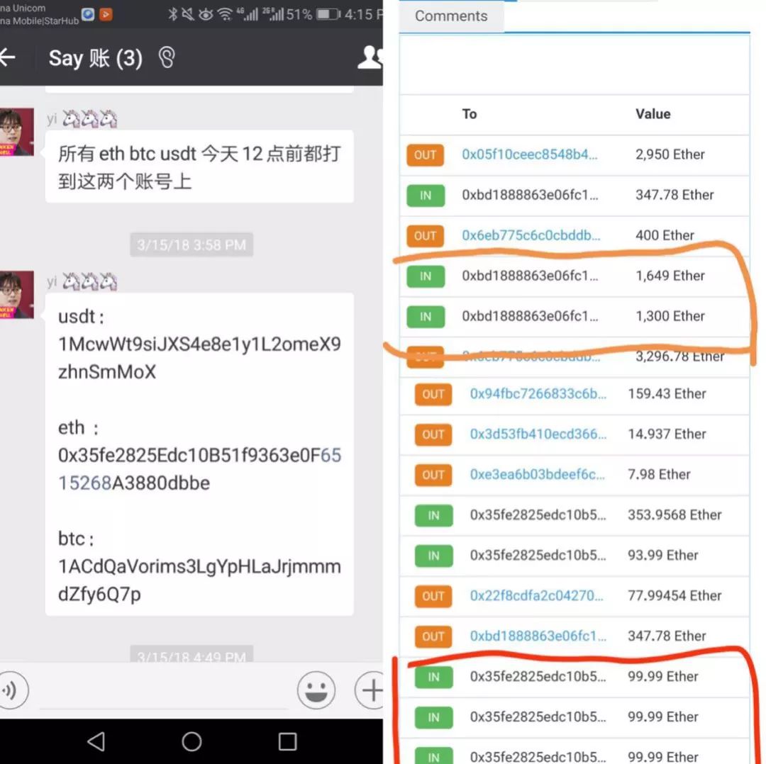 从左到右依次为孙高峰给出的石一的钱包地址,他称在OCN私募5万ETH,石一私下转移了4万个。