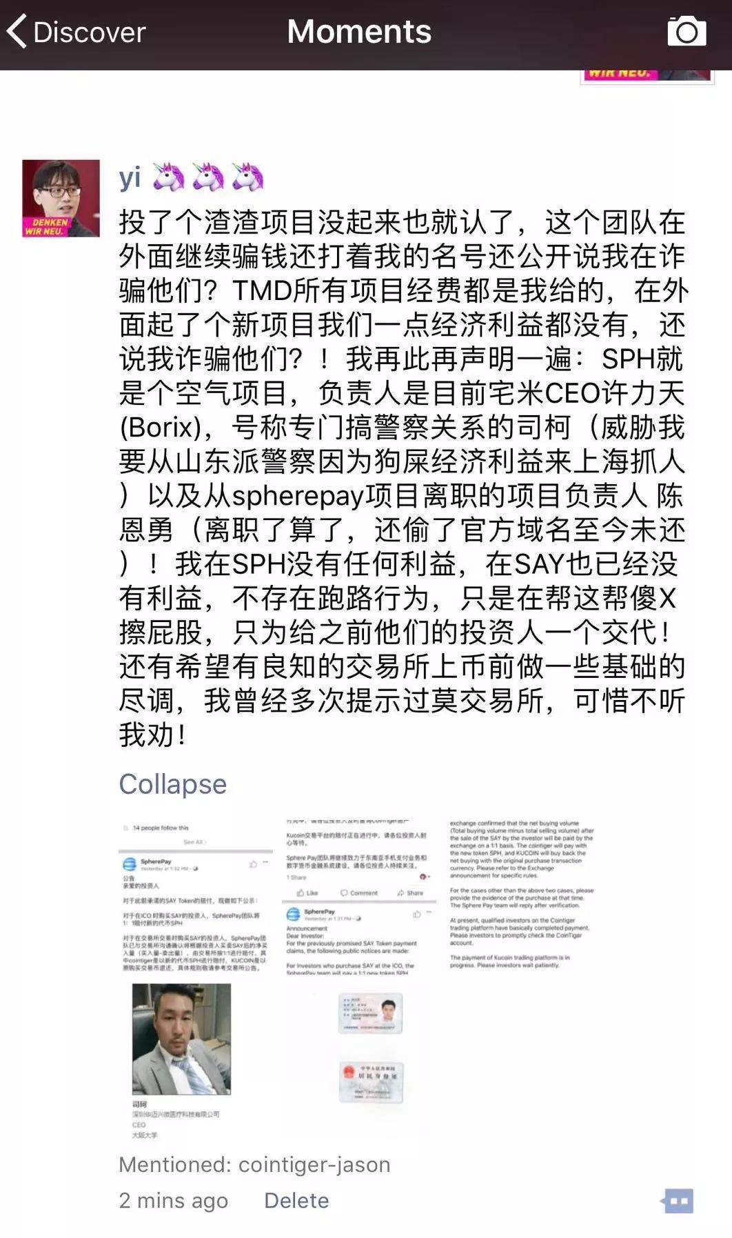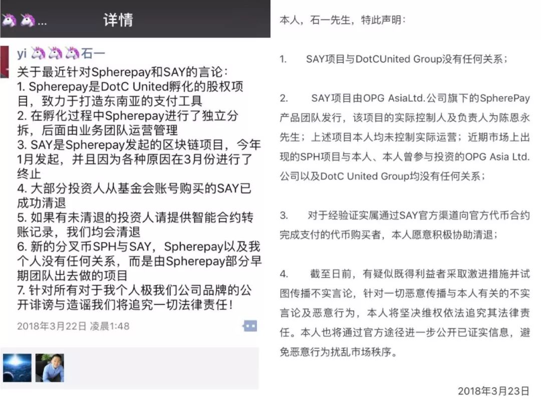 3月22日下午,SAY项目方(Spherepay)发言人澄清,大致意思为:项目方已与石一先生发生重大分歧,项目会继续进行(发行SPH),原有SAY私募投资人需要进行退币,请直接与石一先生联系。