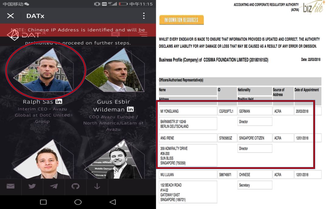 作为第三个与石一有所牵连的数字货币——DATx,二者关系依然密切。DATx号称全球数字广告第一链,白皮书介绍中,其实际控制人为荷兰人Ralph Sas,与石一无任何瓜葛。其实不然,Ralph Sas实际为Avazu的CEO,而后者为DotC United Group的子公司。