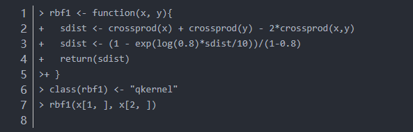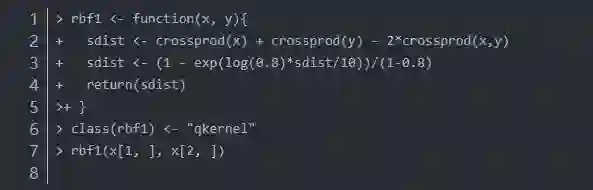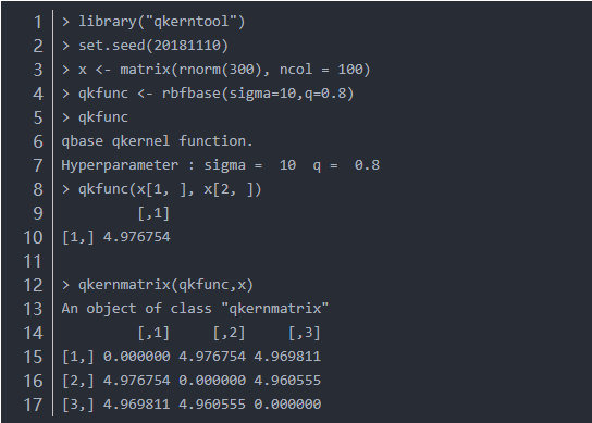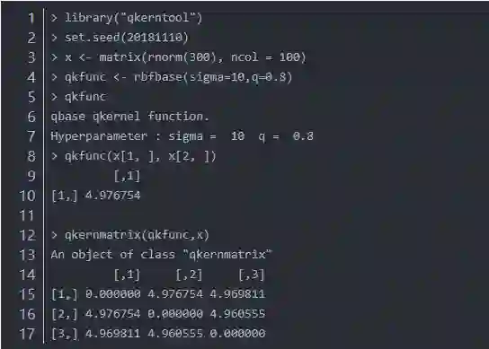 为了通过R实现负定核表达,构建了一个S4类R包,其中表示为类“qkernel”或“cndkernel”的对象。这些函数可以作为参数传递给泛型函数,这些函数可以评估更有用的内核表达式,如核矩阵
