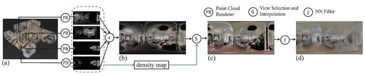 方法的输入是环境的3D模型(比较粗糙)和一系列视角采集到的图片。对于要渲染的任意一个视点,我们选取周围的k个视点,将每个视点的每个像素投射到3D模型上,得到一个三维点云。之后,我们对3D点云进行简单的双线性插值,得到一个初步的渲染结果。