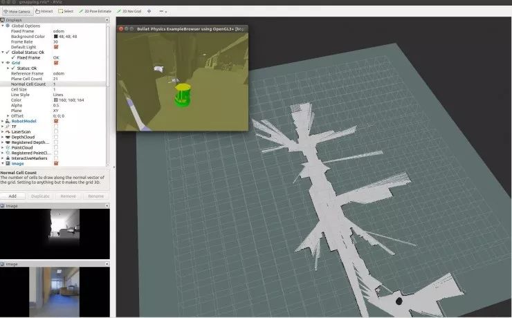 由于面向的是机器人的应用,我们集成了Gibson模拟环境和机器人操作系统,ROS的用户可以方便地使用Gibson Env作为模拟器,来模拟摄像头或者kinect输入。下图是用Gibson模拟器模拟机器人建图 (mapping) 的一个简单的demo。