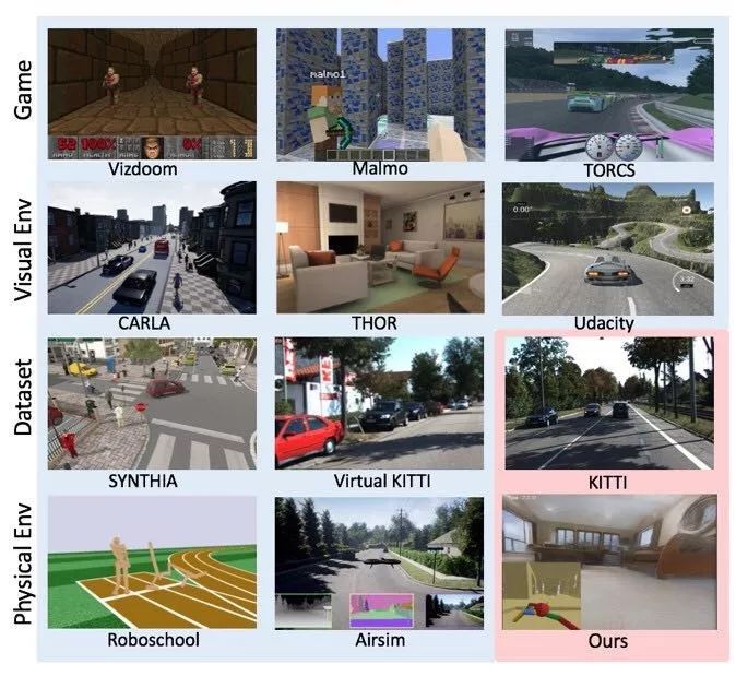 这张图涵盖了目前主流的模拟环境,包括游戏类的毁灭战士(VIZdoom),侠盗猎车(GTA),驾驶类的CARLA,物理类的Roboschool。之前提到的解迷宫、行走智能体就出自这些环境。有了这些成果,我们能不能将智能体运用于实际生活中,解决驾驶、机器人行走的问题呢?