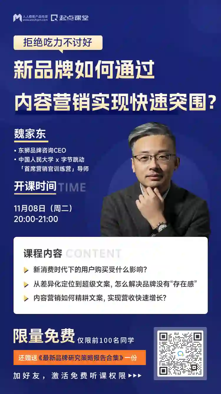 老师将会从数据分析、人群特征、内容获取方式等出发,解析时代趋势变化,以及变局下的新品牌如何通过差异化定位到超级文案,实现快速崛起、出圈,告诉大家低成本、可复制的破局方法,找到新的营收增长入口!