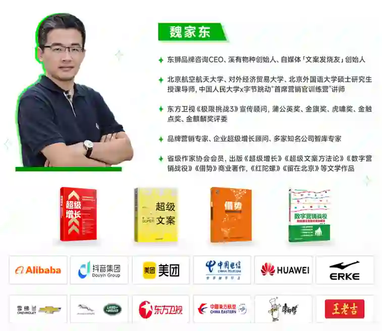 本次授课老师为中国人民大学x字节跳动“首席营销官训练营”导师@魏家东老师,具有20年+文案营销经验,服务过100+品牌,是多家知名公司智库专家、企业超级增长顾问,也是自媒体「文案发烧友」创始人、东狮品牌咨询CEO。