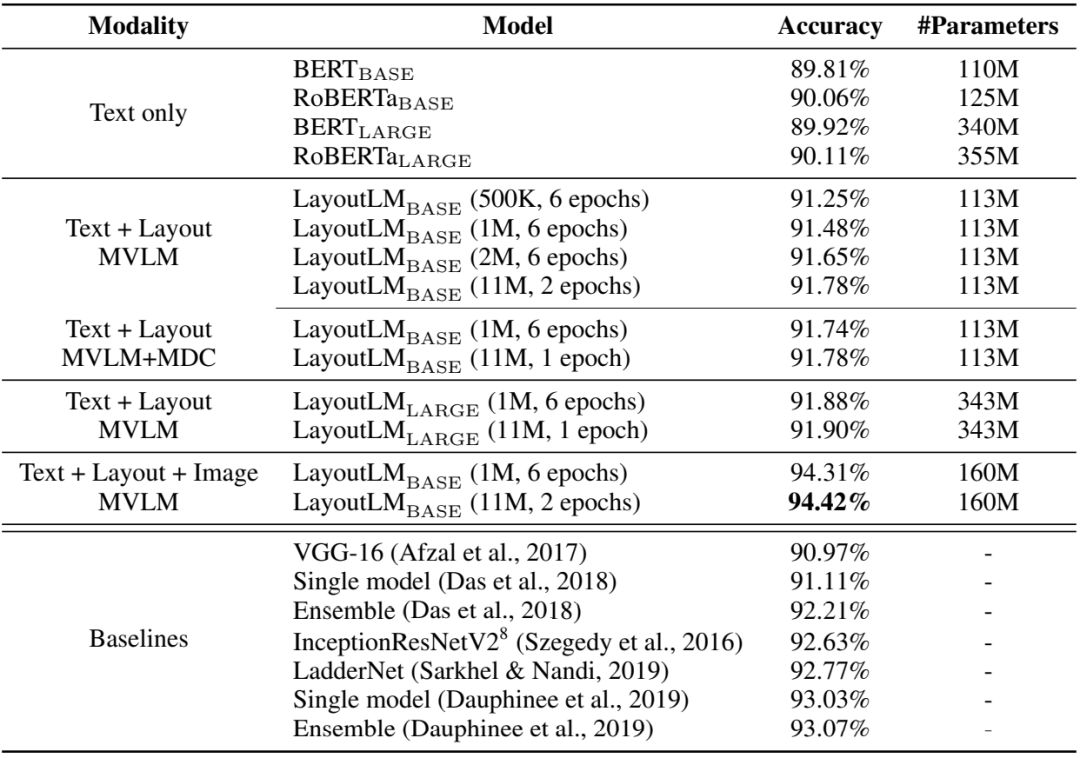 表3:LayoutLM 在 RVL-CDIP 数据集上的实验结果