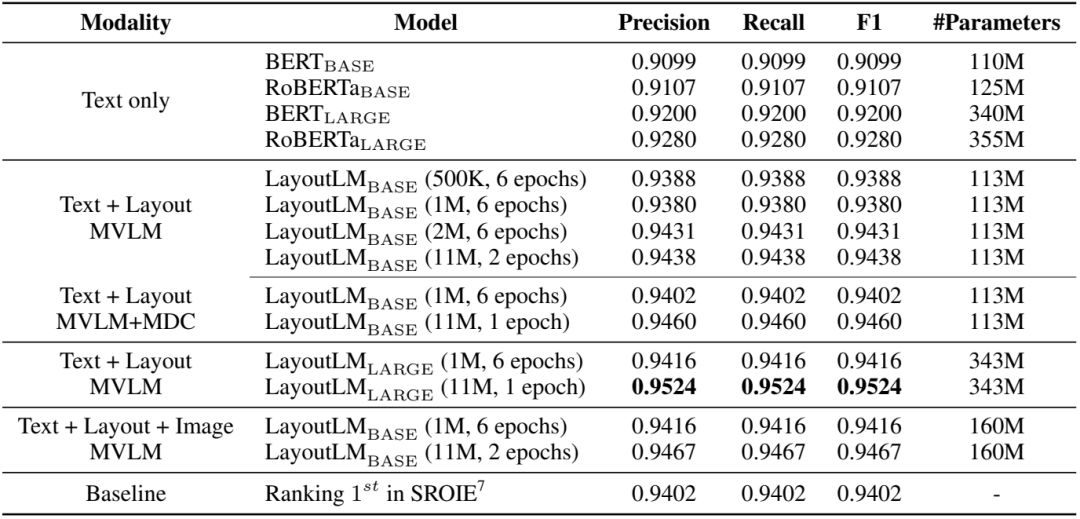 表2:LayoutLM 在 SROIE 测评上的实验结果