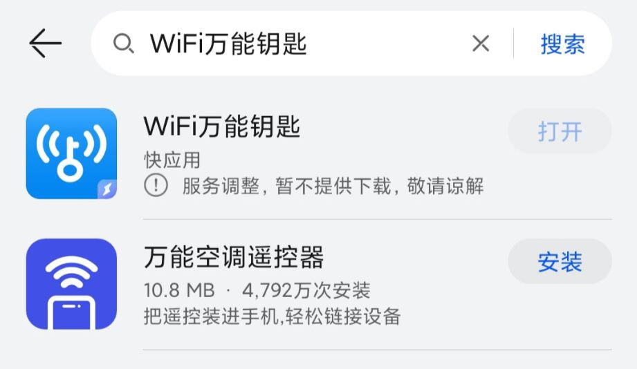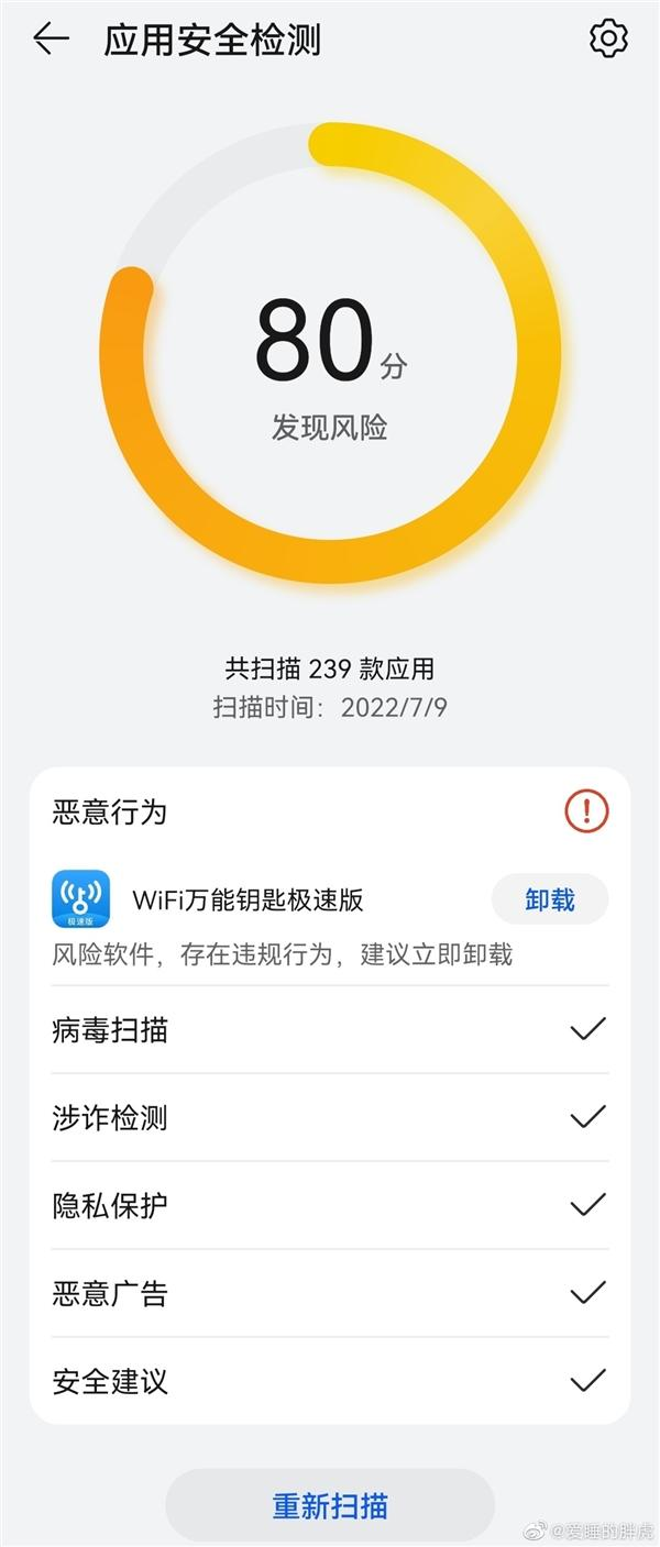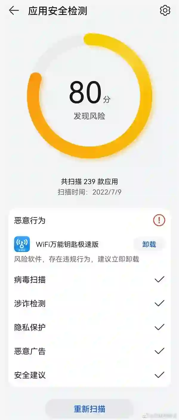 据华为手机用户近日反馈,用户检测手机安全问题时,系统检测提示 WiFi 万能钥匙是一款风险软件,存在违规行为,建议立即卸载。而目前华为应用市场已经“暂不提供下载” WiFi 万能钥匙。