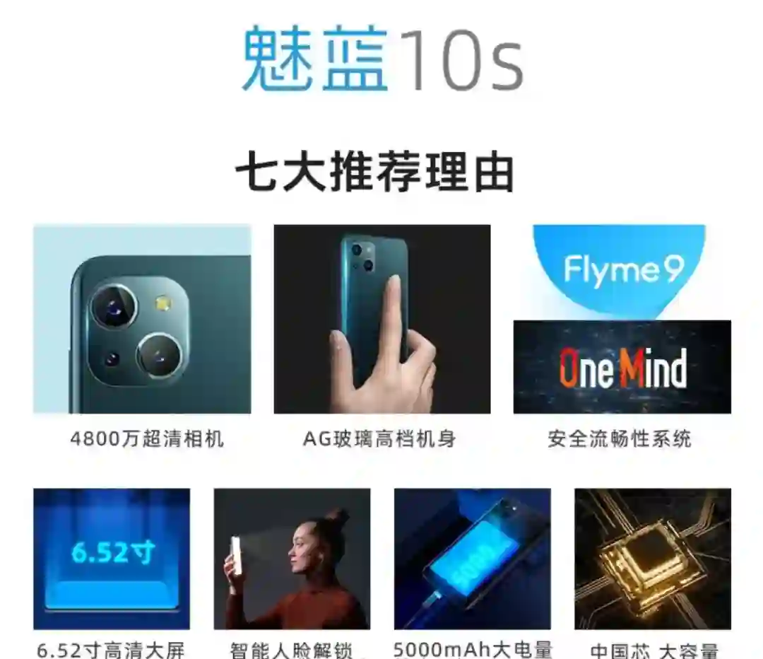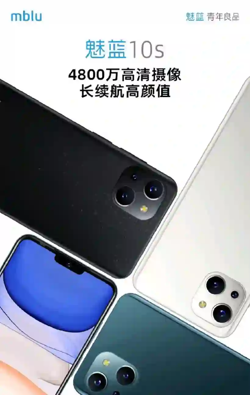外观方面,魅蓝 10s 配备一块 6.52 英寸 LCD 刘海,1600*720 分辨率,支持 60Hz 刷新率。机身背面则采用左上角矩形三摄设计,排列方式和 iPhone 13 几乎完全一致。机身还采用 AG 玻璃材质后盖,保留 3.5mm 耳机接口。机身背面配备有 4800W+200W+30W 像素后置三摄,前置为 800W 自拍单摄,内置 5000mAh 大容量电池,并支持 10W 功率有线充电。
