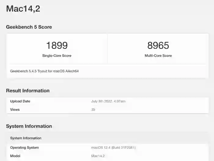 据 macOS 平台开发工程师 Mr. Macintosh 爆料,苹果 M2 MacBook Air 首个跑分数据已经出炉,M2 MacBook Air 的 Geekbench 5 CPU 单核跑分 1899,多核跑分 8965,运行 macOS 12.4 操作系统,配备 16GB 统一内存。此外,Geekbench 5 平台的其余跑分显示,M2 MacBook Air 运行频率 3489MHz,单核大致在 1900 左右,多核大致在 8800 左右。