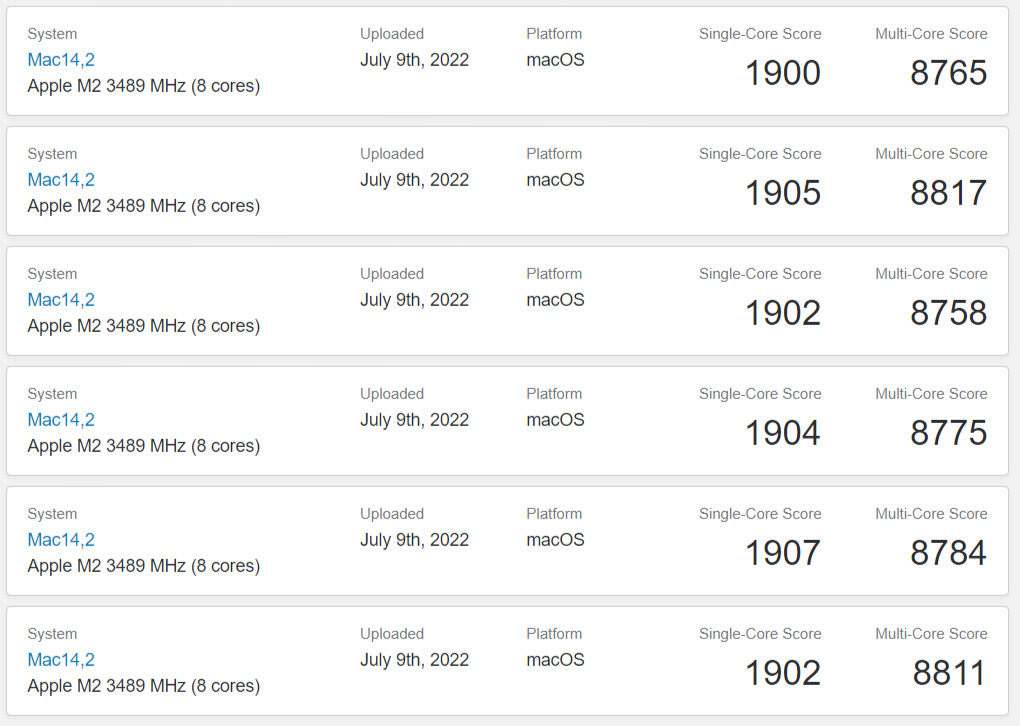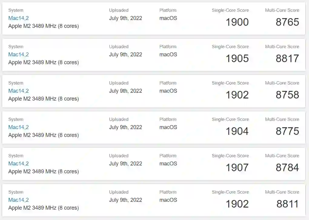据悉,这些分数与配备 M2 芯片的 13 英寸 MacBook Pro 取得的分数大致相同,证实这两款笔记本在测试中具有几乎相同的性能,正如 M1 型号的情况一样。虽然 M2 芯片在 MacBook Air 和 MacBook Pro 的 Geekbench 测试中表现相当,但在实际使用中,MacBook Pro 在持续的、高要求的工作负载中仍可能表现得更好,因为 MacBook Air 没有风扇主动散热。