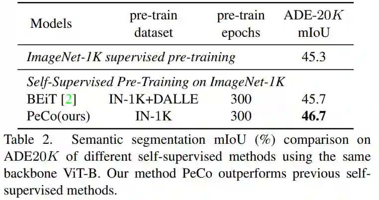 语义分割任务:该研究将 PeCo 与 1)在 ImageNet-1K 上进行监督预训练和 2)BEiT(SOTA 性能自监督学习模型)进行比较,评估指标是 mIoU,结果如表 2 所示。由结果可得,PeCo 在预训练期间不涉及任何标签信息,却取得了比监督预训练更好的性能。此外,与自监督 BEiT 相比,PeCo 模型也获得了较好的性能,这进一步验证了 PeCo 的有效性。
