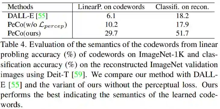 此外,该研究还与不使用感知相似性的变体进行了比较。如表 4 所示, 我们可以发现感知码字在线性评估和重构图像分类方面获得了更高的准确率。这表明感知 codebook 具有更多的语义意义,有利于图像重构过程。