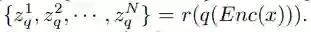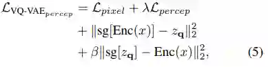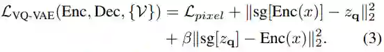 其中 q 是量化编码器,可以将向量映射到 codebook 索引,r 是量化解码器,可以从索引重构向量。基于量化的码字为 z_q,解码器旨在重构输入图像 x。VQ-VAE 的训练目标定义为: