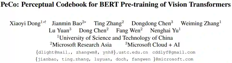 来自中国科学技术大学、微软亚研等机构的研究者提出了 PeCo,用于视觉 transformer 的 BERT 预训练,在多项任务上实现最高性能。