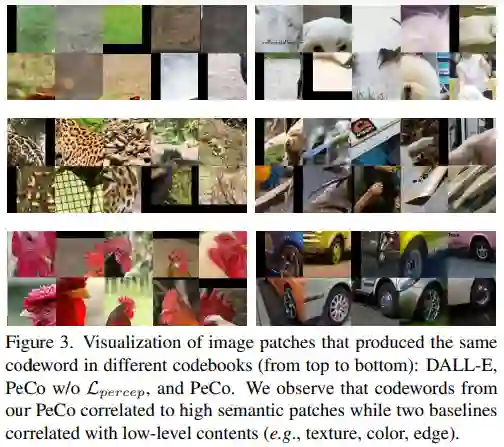 首先,该研究将对应于相同码字的图像 patch 进行可视化,并与两个基线进行比较:在 2.5 亿私有数据上训练而成的 DALL-E codebook;不使用感知相似性的 PeCo 模型的一个变体。结果如图 3 所示,我们可以看到该研究码字与语义高度相关,如图中所示的轮子,来自基线的码字通常与低级信息(如纹理、颜色、边缘)相关。