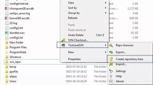 【步骤17】在C盘(其他盘也可以)创建文件夹svn_repo。在svn_repo文件夹图标上右击,在快捷菜单选择TortoiseSVN|Create repository here。