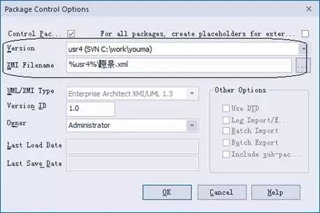 【步骤31】勾选Control Package复选框,在version栏选择usr4,在XMI Filename栏把文件名改为愿景.xml,单击OK。