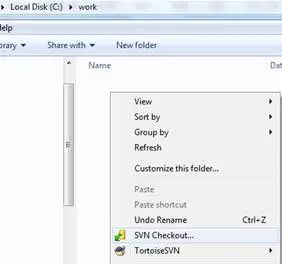 【步骤19】在C盘创建名为work的文件夹,右击work文件夹内的空白处,在快捷菜单选择SVN Checkout。