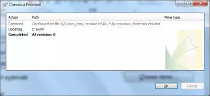 【步骤20】在对话框中设置URL of repository为file:///C:/svn_repo,设置Checkout directory为C:\work。单击OK。