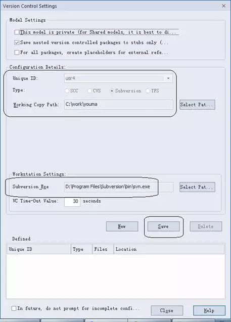 【步骤29】双击youma.eap,从主菜单选择Project | Version Control | Version Control Settings,分别照图上设置,单击Save,再单击Close。