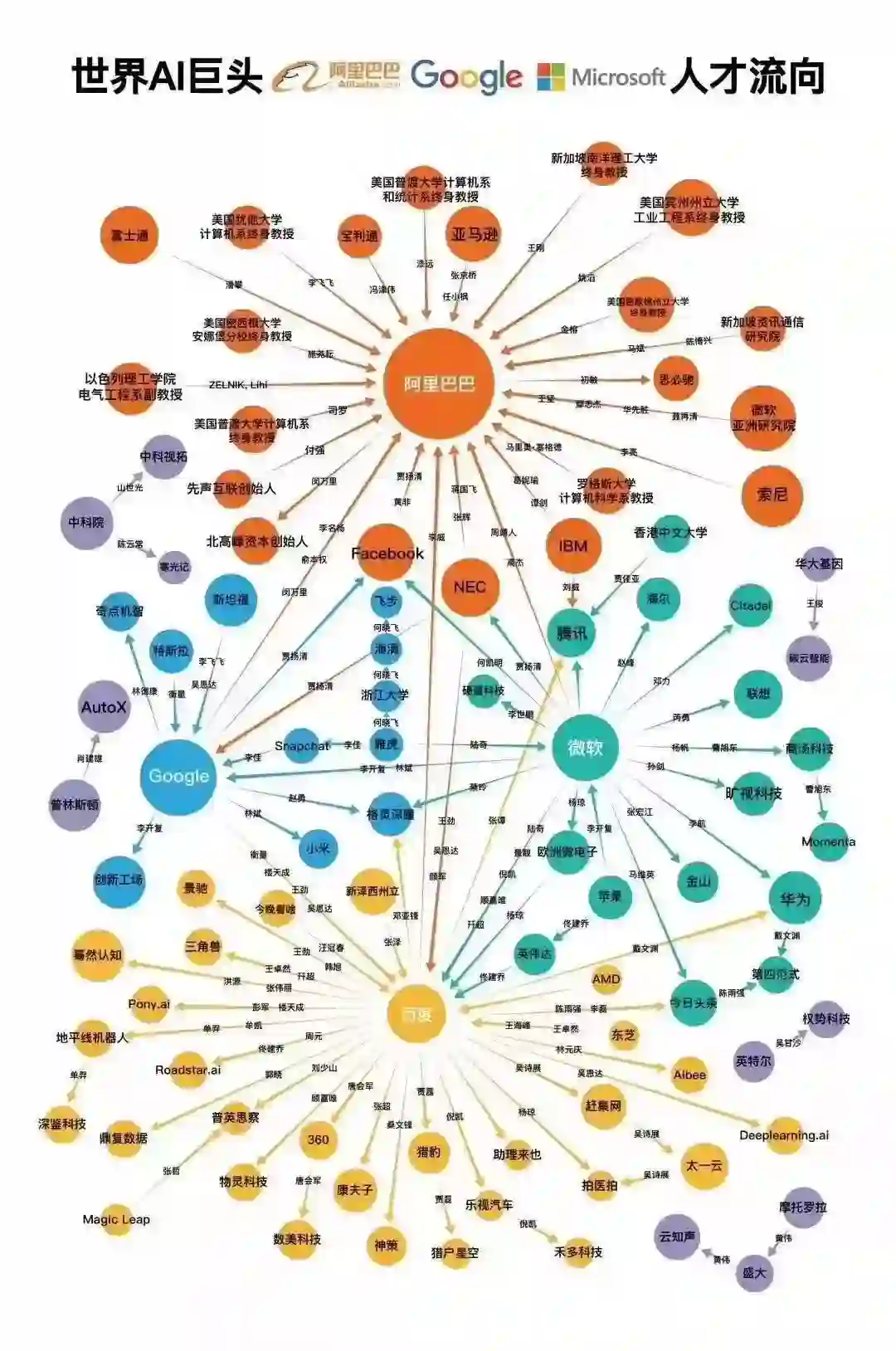 前不久,一张“世界AI巨头人才流向图”刷屏整个科技圈,图中显示了AI界众多知名公司之间的人才流动情况,其中百度、微软成为人才流失最严重的两个科技巨头。