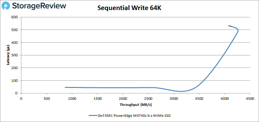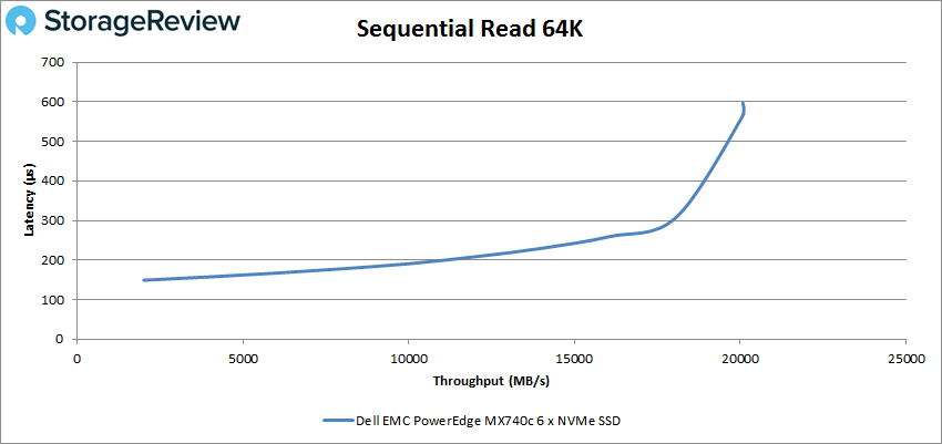 对于 64K 顺序读,MX 开始速度为 32,114 IOPS 或 2.01GB/s,延迟为 149 微秒,并在一个轻微下降之前,以 563 微秒的延迟达到大约 321K IOPS 或 20.1GB/s 的峰值。