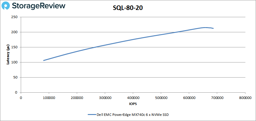 对于 SQL80-20,MX 在 102.3 微秒时为 80,819 IOPS,在 212.3 微秒时达到 685,983 IOPS。