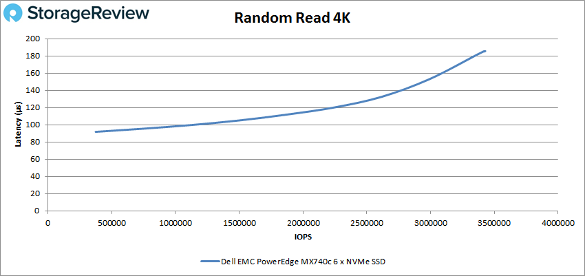 对于随机 4K 读取,戴尔易安信 PowerEdge MX 的启动速度为 373,951 IOPS,延迟为 91.8 微秒;随后以 3,420,310 IOPS 的速度达到峰值,延迟仅为 185.5 微秒。