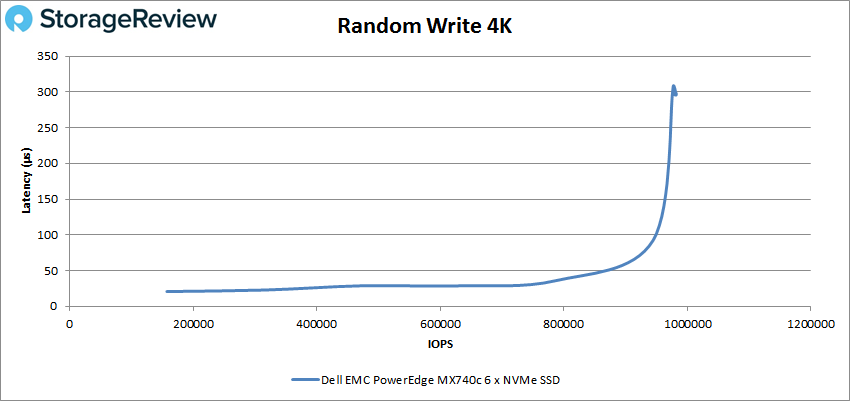 对于随机 4K 写,MX 的启动速度为 157,421 IOPS,延迟仅为 20.7 微秒,并在 307.7 微秒时达到 977,199 IOPS 的峰值。