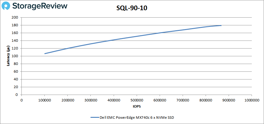 对于SQL90-10,MX的启动速度为100,690 IOPS,延迟为106.3微秒,并且在863,625 IOPS时达到峰值,延迟为179.2微秒。