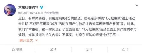 据悉,近日,有媒体转载、引用此前8月份的报道,质疑京东拼购“1元抢爆款”线上活动未注明“不成团不退款”以及“活动在用户付款后才告知需邀新用户参团”等。对此,京东方面表示,我们非常重视,第一时间进行了全面自查:“1元抢爆款”活动页面上有详细的参与规则,媒体报道的相关内容并不属实。