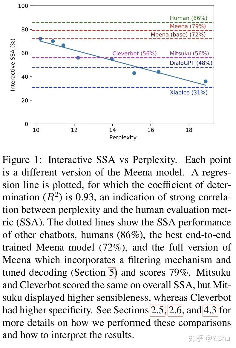 作者感到惊讶但高兴的是,无论是在静态评估还是互动评估中,SSA指标都与Meena的困惑紧密相关。换句话说,Meena越适合其训练数据,其聊天响应就越敏感和具体。乍一看,这个结果看似直观,但它令我们惊讶,因为最近的研究发现,人类评估得分与BLEU等自动指标之间的关联性很差(Liu等人,2016;Lowe等人, 2017)。