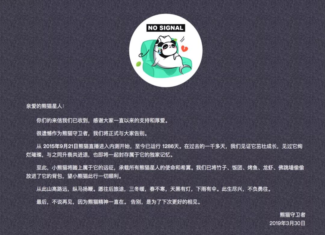 36氪讯,3月30日,熊猫直播官网发布公告,宣布熊猫直播正式关站。熊猫直播在公告中表示,“很遗憾作为熊猫守卫者,我们将正式与大家告别,从 2015年9月21日熊猫直播进入内测开始,至今已运行 1286天。” 这标志着由王思聪创立的熊猫直播最终退出历史舞台。