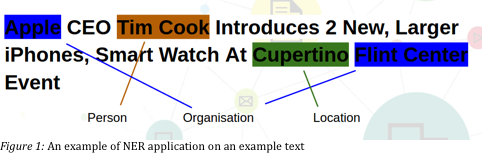 另外,该团队在CoNLL 2003 NER数据集[19]中训练了BiLSTM + CRF模型,该模型包含四种类型的实体:人 (PER)、组织 (ORG)、位置 (LOC)和其他名称 (MISC)。