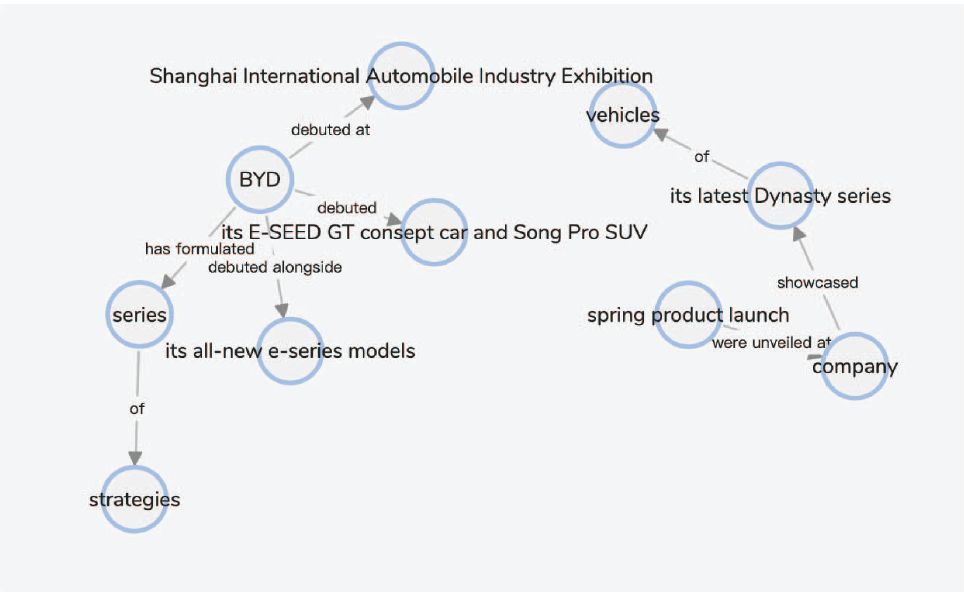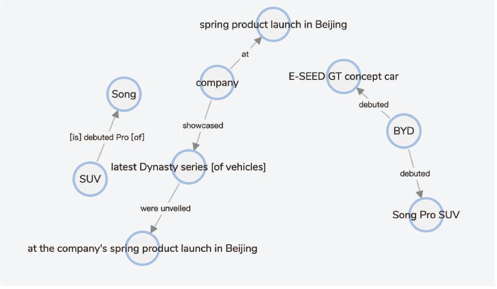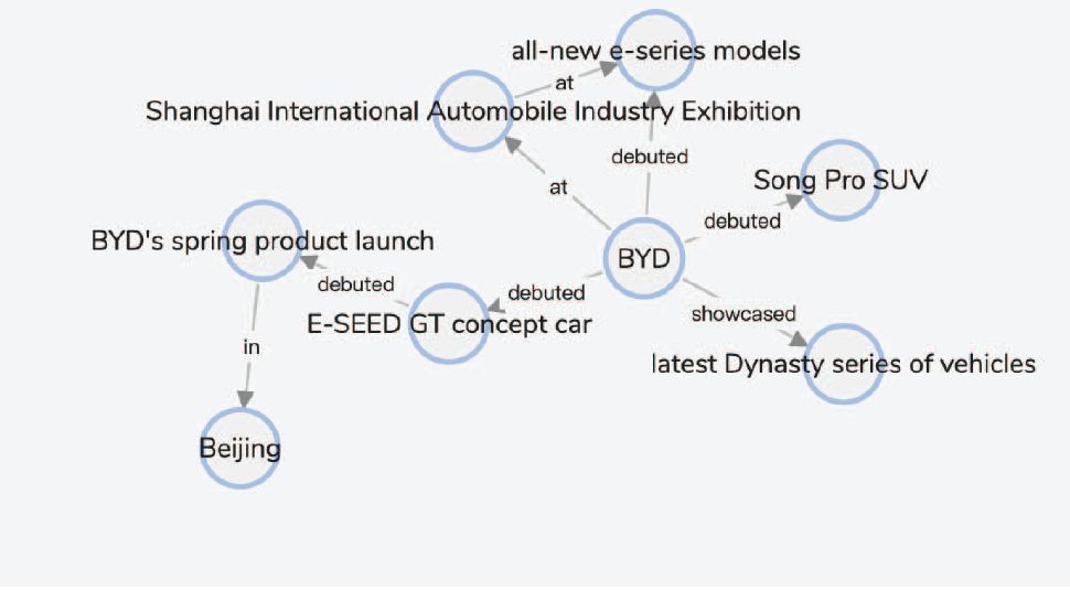 eam Tmail生成的图谱如下图所示。该团队已经成功识别大多数实体,并正确链接。然而,他们的模型中并未完全过滤重复的三元组(如,‘Song’和‘ Song Pro SUV’),也未识别出语义上属于同一实体的词组(如,‘ BYD’和‘company’)。