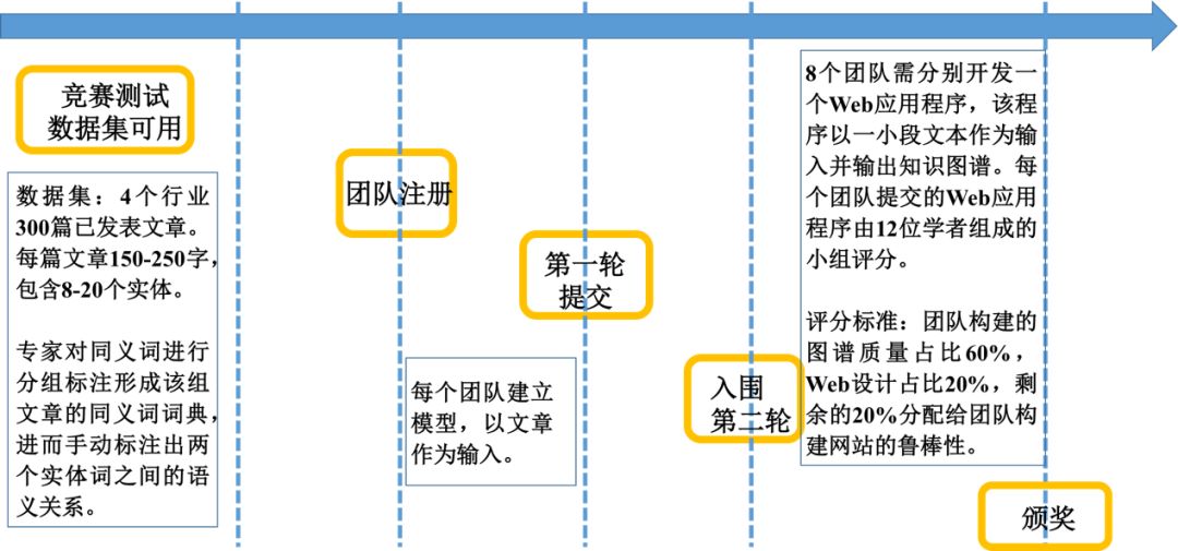 在这次比赛中,参赛团队需在至少两个不同领域的非结构化文本中自动构建知识图谱(即在无人工干预的情况下,从特定领域或多个领域的非结构化文本中构建知识图谱),并开发一个应用程序将其可视化。