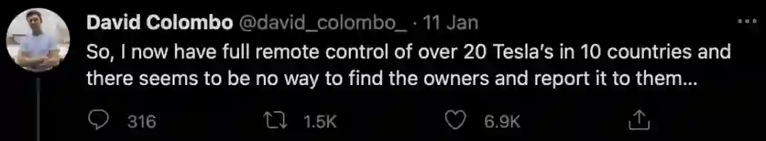 前两天,一位来自德国的19岁年轻黑客突然发推表示,自己已经实现了10个国家的20多辆特斯拉的远程控制。