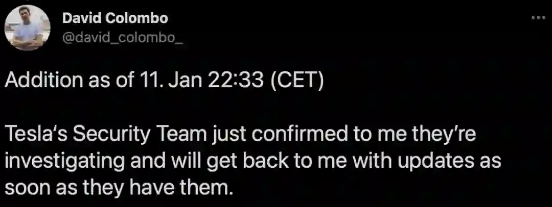 目前,Colombo表示特斯拉的安全团队成员已经与自己进行了接触,并将着手展开调查。